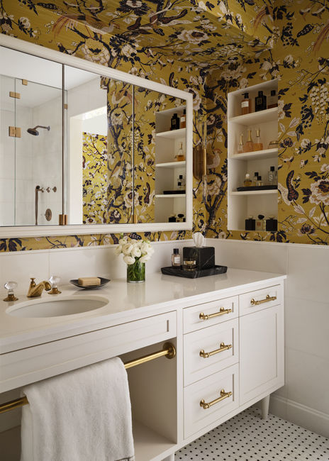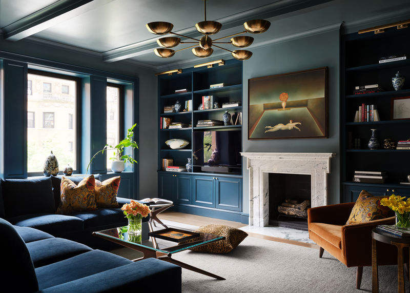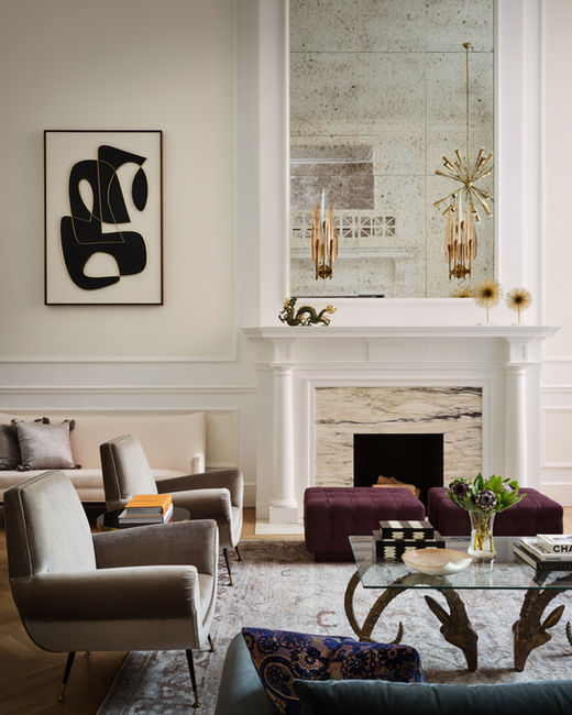 This duplex apartment in a grand 1907 apartment building underwent a major renovation. Within the unique two-story great room, a new custom wood mantel, panel moldings, and plaster crown were added. New black steel doors connect the great room to the family room. At the family room, new built-in bookshelves and a custom marble mantel are a focal point for the space. The existing stair off the great room was rebuilt with new oak steps, bronze spindles, and paneled storage below. At the upper level, bedrooms and bathrooms have custom millwork and luxurious finishes. Martin Brandwein worked with interior designer Michele Bitter on this project.